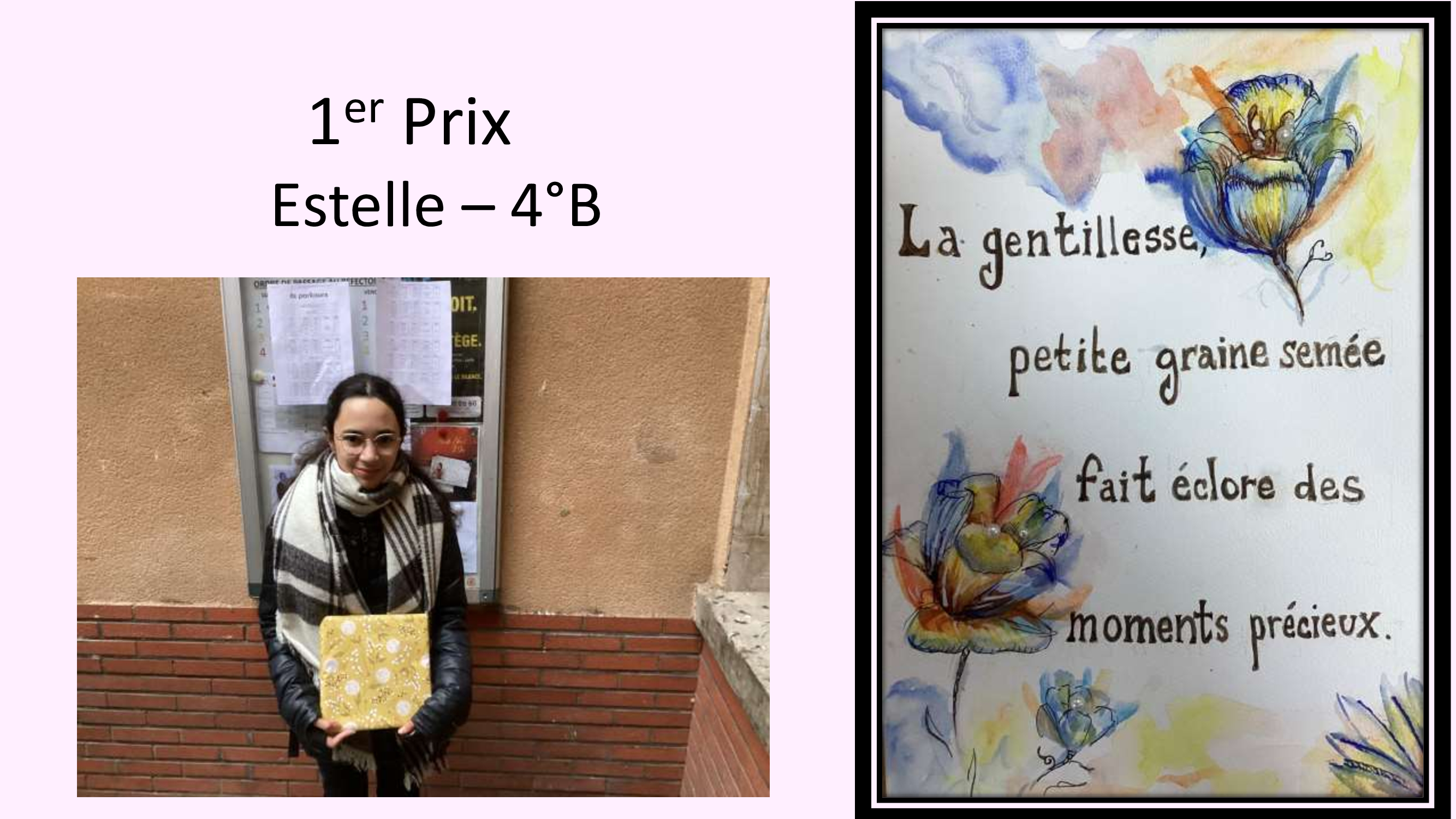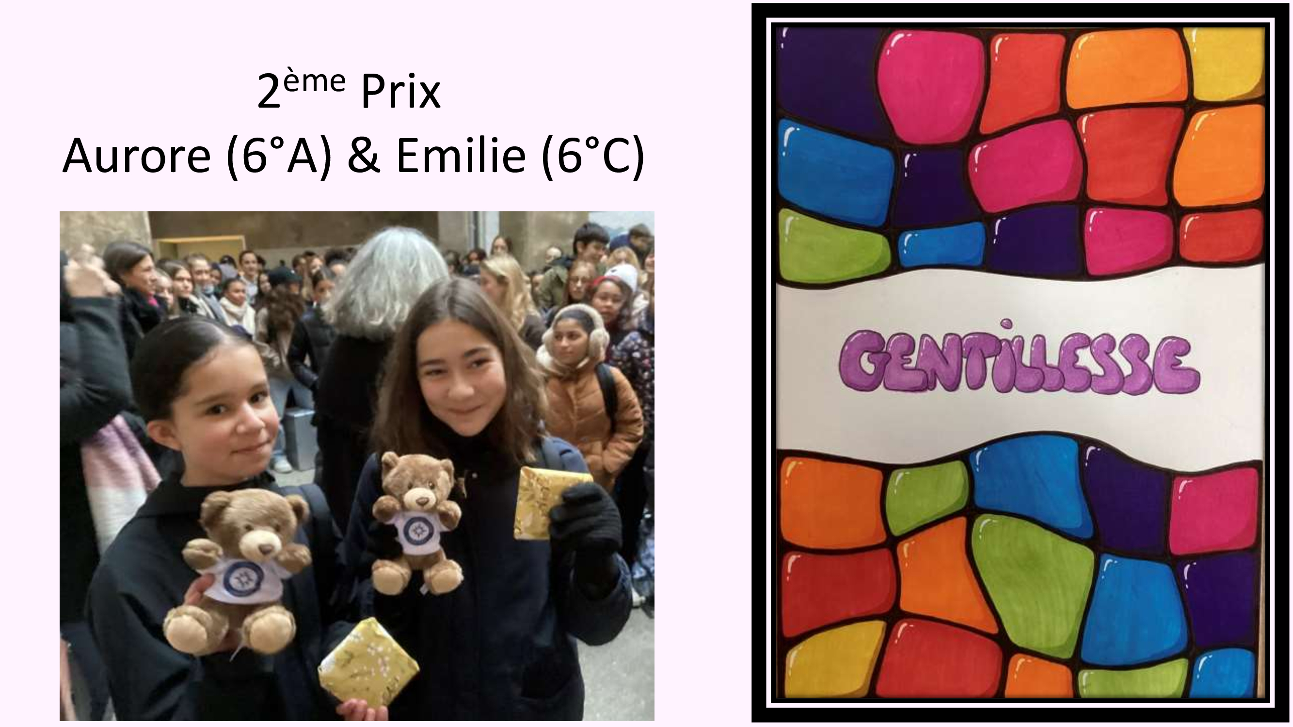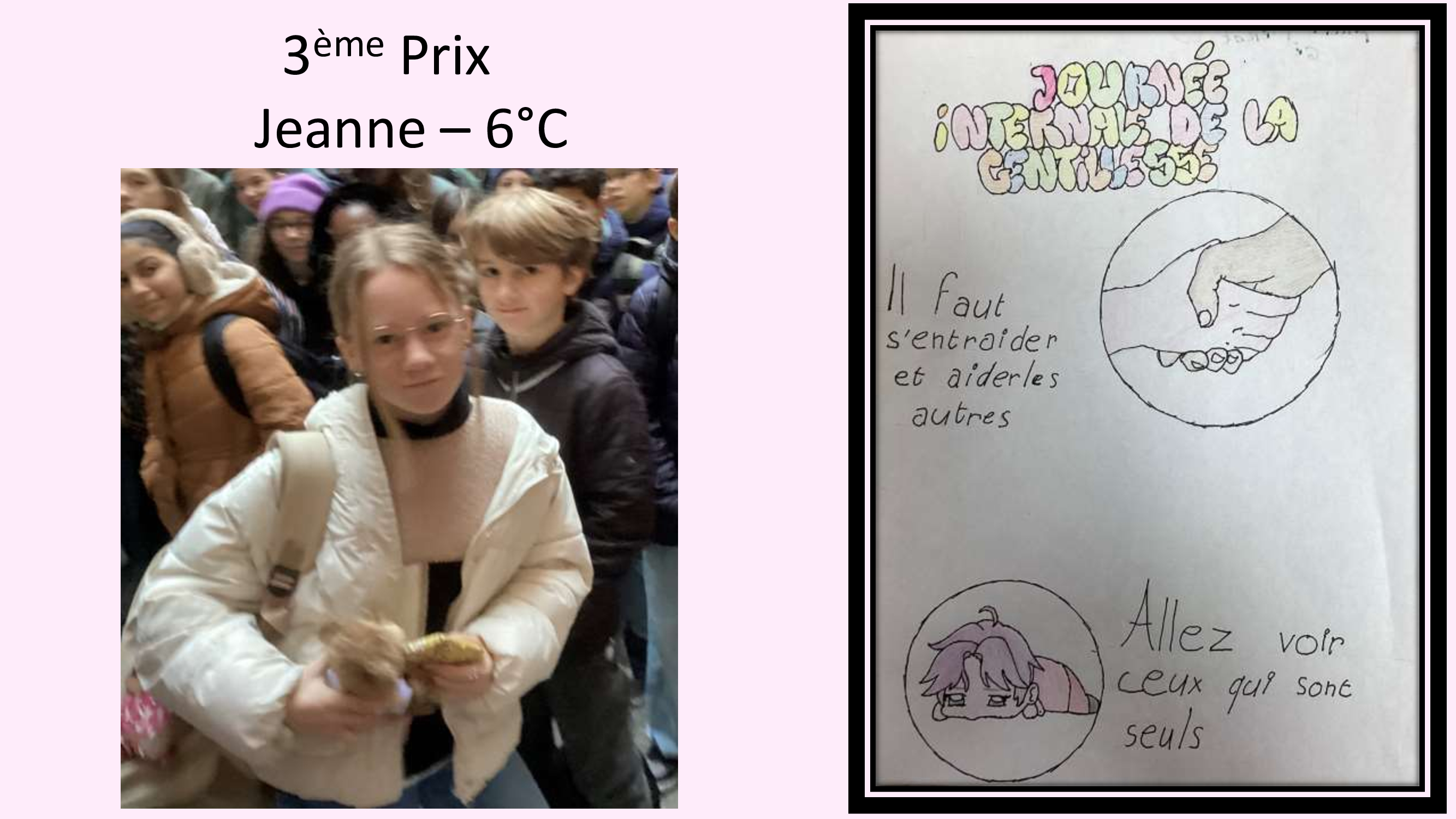 Jeudi 13 novembre, nous avons célébré la Journée mondiale de la gentillesse. Pour marquer l’occasion, nous avons organisé un concours d’affiches, invitant chacun à exprimer visuellement ce que représente la gentillesse. Trois affiches ont particulièrement retenu l’attention du jury, par leur créativité et leur message fort et 3 d’entre elles ont été primées : Jeanne (6°) a reçu le 3ème Prix, Aurore et Emilie (6°) le 2ème. Quant au premier Prix, il a été décerné à Estelle, élève de 4°. Bravo à elles !